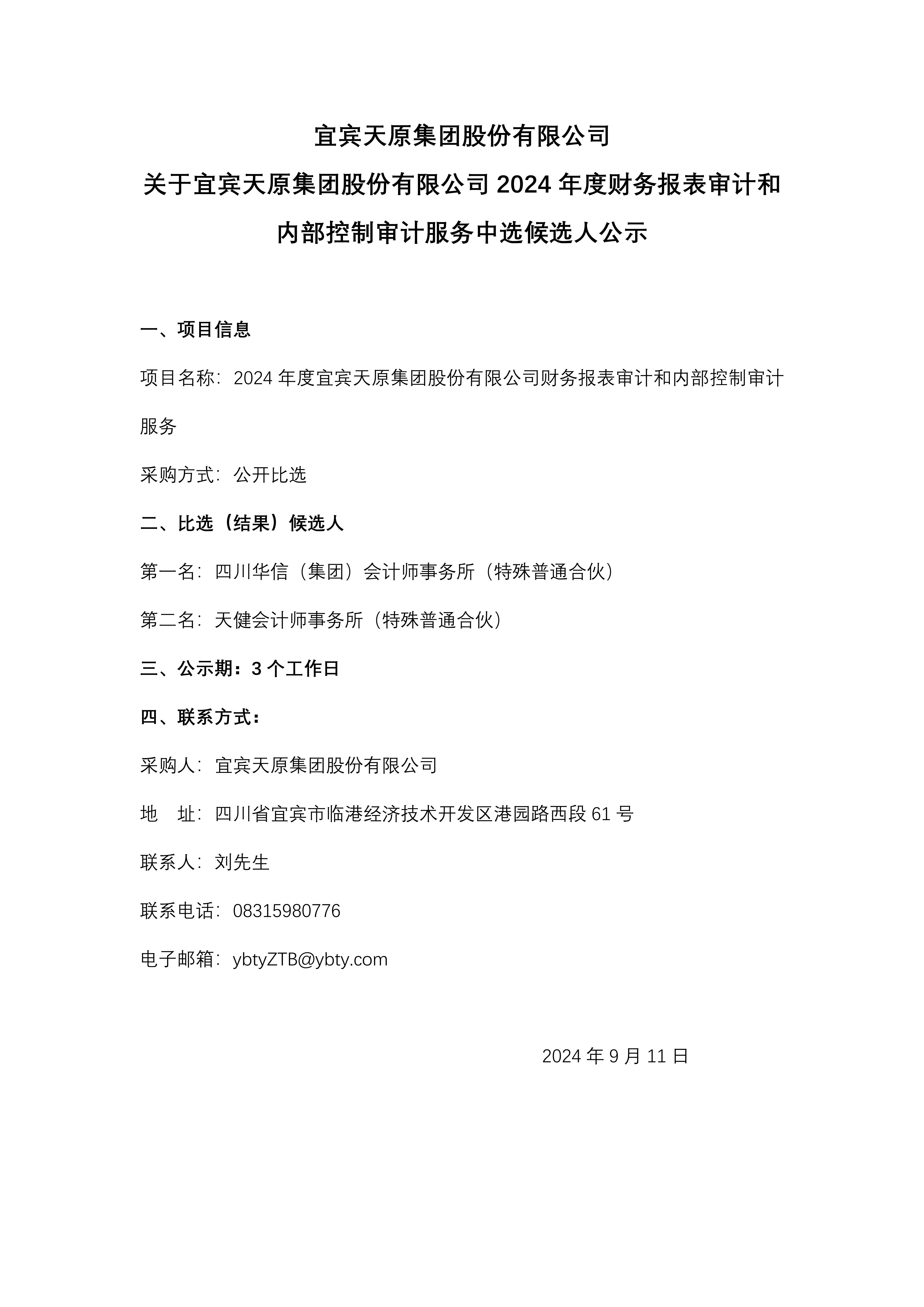 關(guān)于宜賓天原集團(tuán)股份有限公司2024年度財(cái)務(wù)報(bào)表審計(jì)和內(nèi)部控制審計(jì)服務(wù)中選候選人公示