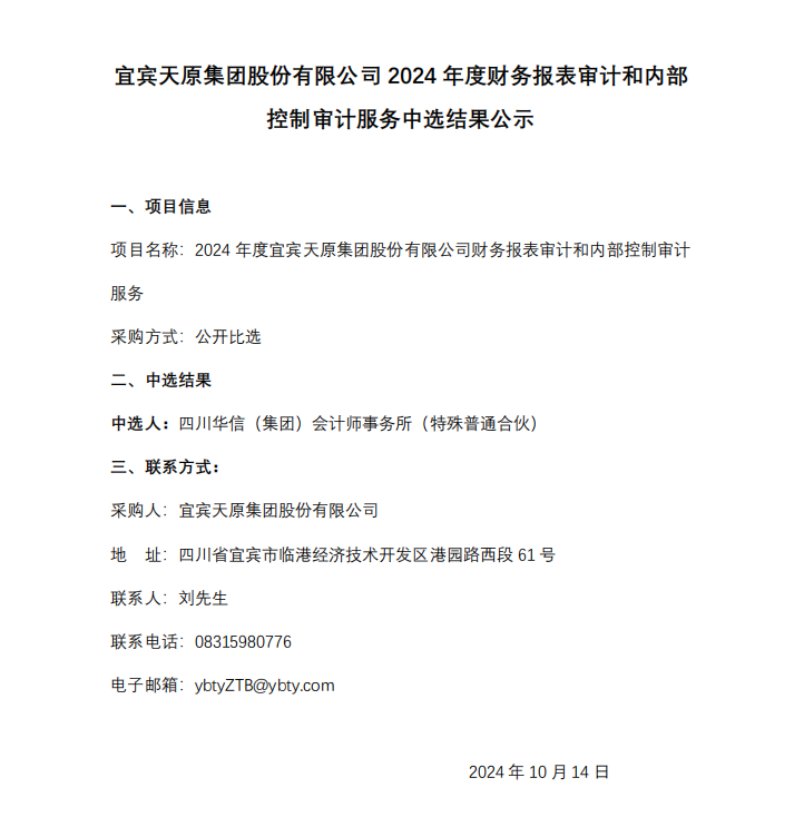 宜賓天原集團(tuán)股份有限公司2024年度財(cái)務(wù)報(bào)表審計(jì)和內(nèi)部控制審計(jì)服務(wù)中選結(jié)果公示